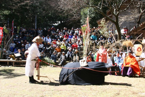 に開催されます。11時頃から岩屋神楽講による神楽の奉納、午後からお田植祭りが始まります。種まきから収穫までの一連の農作業を時に滑稽に表現しながら舞います。春告げ祭とも言われ、お田植祭りが終わるといよいよ求菩提にも春がやってきます。キャンプの翌日は伝統のお祭りをお楽しみください。